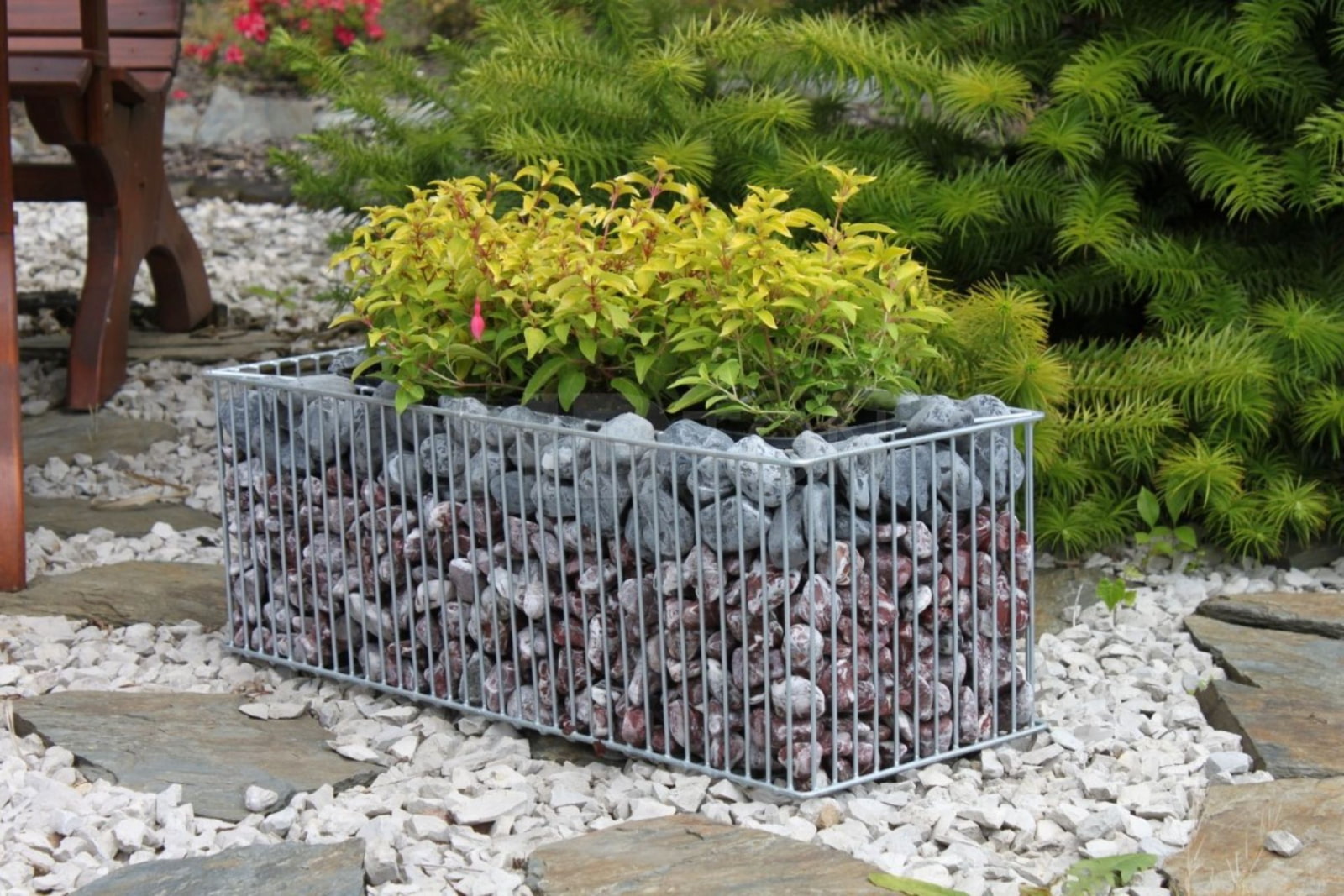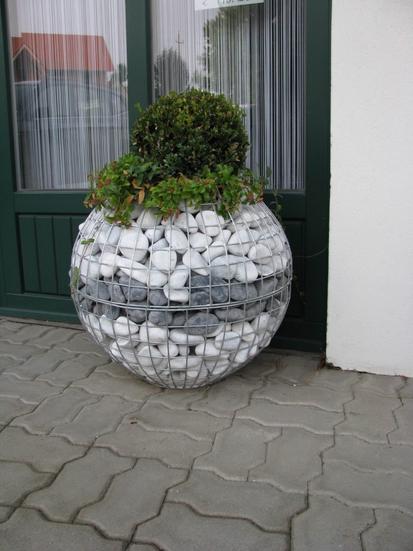 By the way, gabions for flowers are often created separately, without adding benches or tables: both a free-standing stone pots and a mini-garden fenced off with a grid with stones can act as a flower bed.