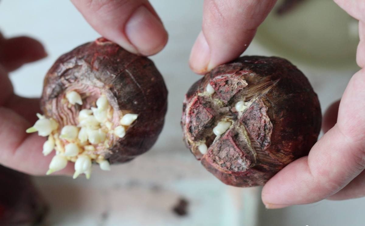 Places of incisions are sprinkled with crushed coal, the bulbs are laid out in wooden boxes with their bottoms up and taken for healing in a dark, dry and warm place (24-26 degrees). After a month and a half, you need to bring the air humidity in the room to 80-85%.