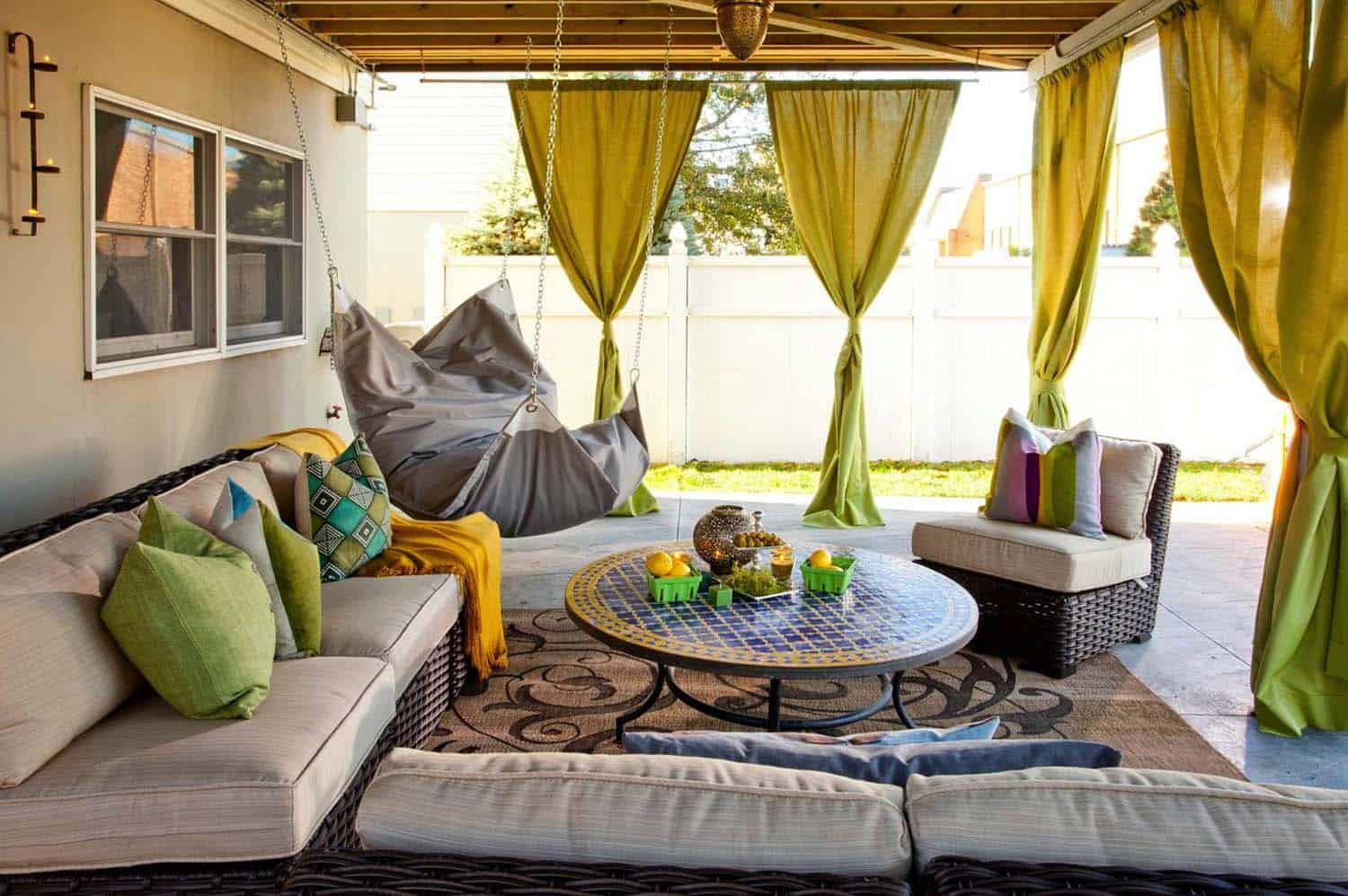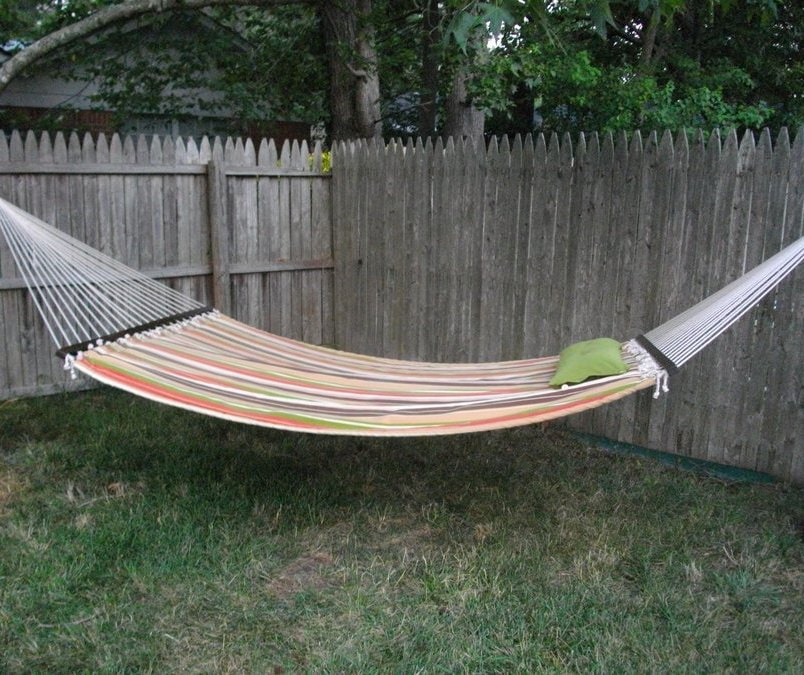 If the height of the fence allows, the pillars of its two spans, converging at right angles, can be used as fasteners. So the space around the fence will be used to the advantage, and the hammock will have enough room to swing.