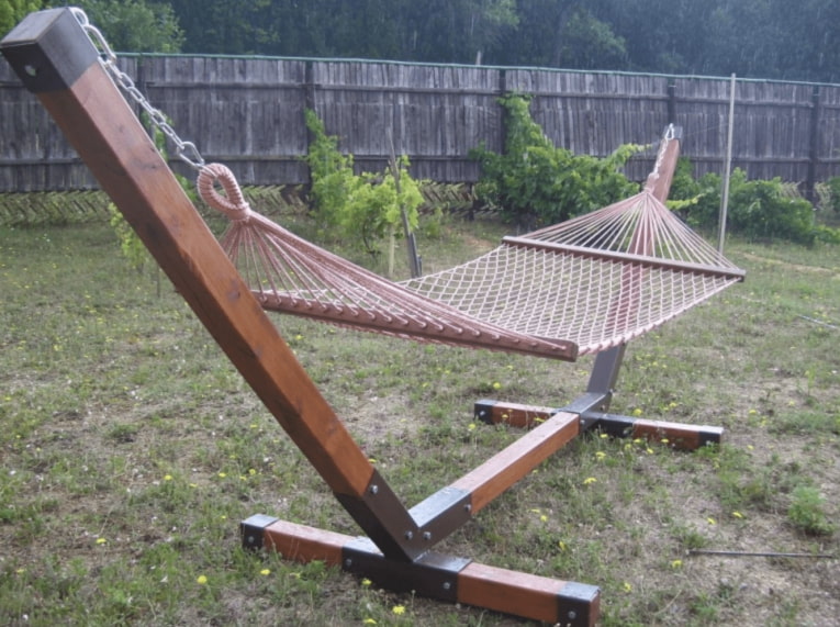 If there is no one to install a hammock in the country, and there is no way to overpay for the services of professionals, you can buy a portable frame hammock. It can be placed wherever you want, if necessary, transferred from the sun to the shade and removed from the street when it starts to rain.