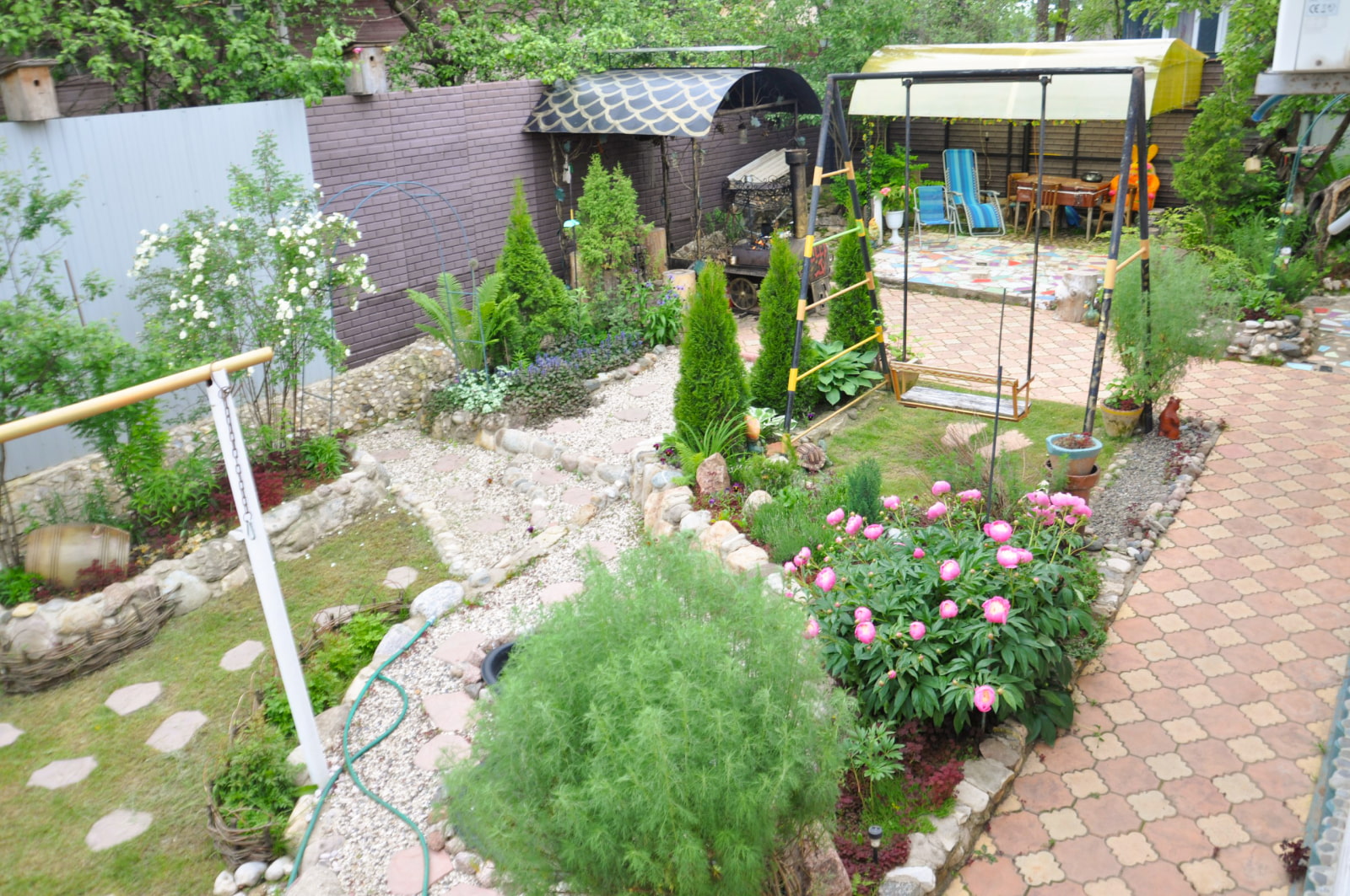 On this site, everything that the owners dreamed of fit in: a canopy with a field kitchen, a swing, a recreation area and a feast in nature. The area is enlivened by thujas, ferns, peony bushes and other flowering plants. Garden paths are made of a wide variety of materials: gravel, natural stone, paving slabs and remnants of tiles, combined into a multi-colored mosaic.