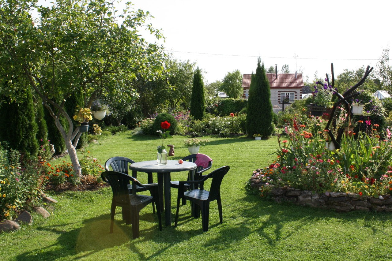 Half of this suburban area is occupied by a recreation area. The owners come out of town not only to work, but also to have a good time. A concrete path leads to a gazebo surrounded by climbing roses. Not far from it there are sun loungers, and in the back of the garden there is a cooking area with barbecue and wooden garden furniture. You can get here along a path of sidewalk tiles, bypassing a barberry bush with bright pink leaves.