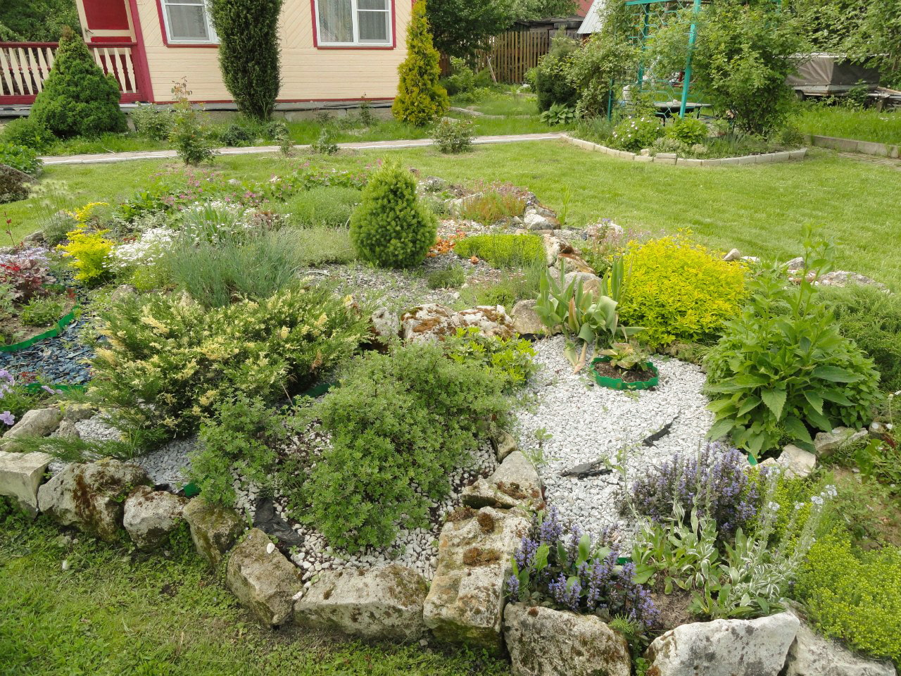 A modest house is located on a plot of 12 acres, so the owners have a place to show their imagination. The owners like open spaces, so most of the territory is occupied by a lawn mixed from bent grass and bluegrass: dense grass does not let weeds through. The main decoration of the landscape is the rock garden - an artificial slide made of stones and plants, imitating a mountain landscape in miniature.