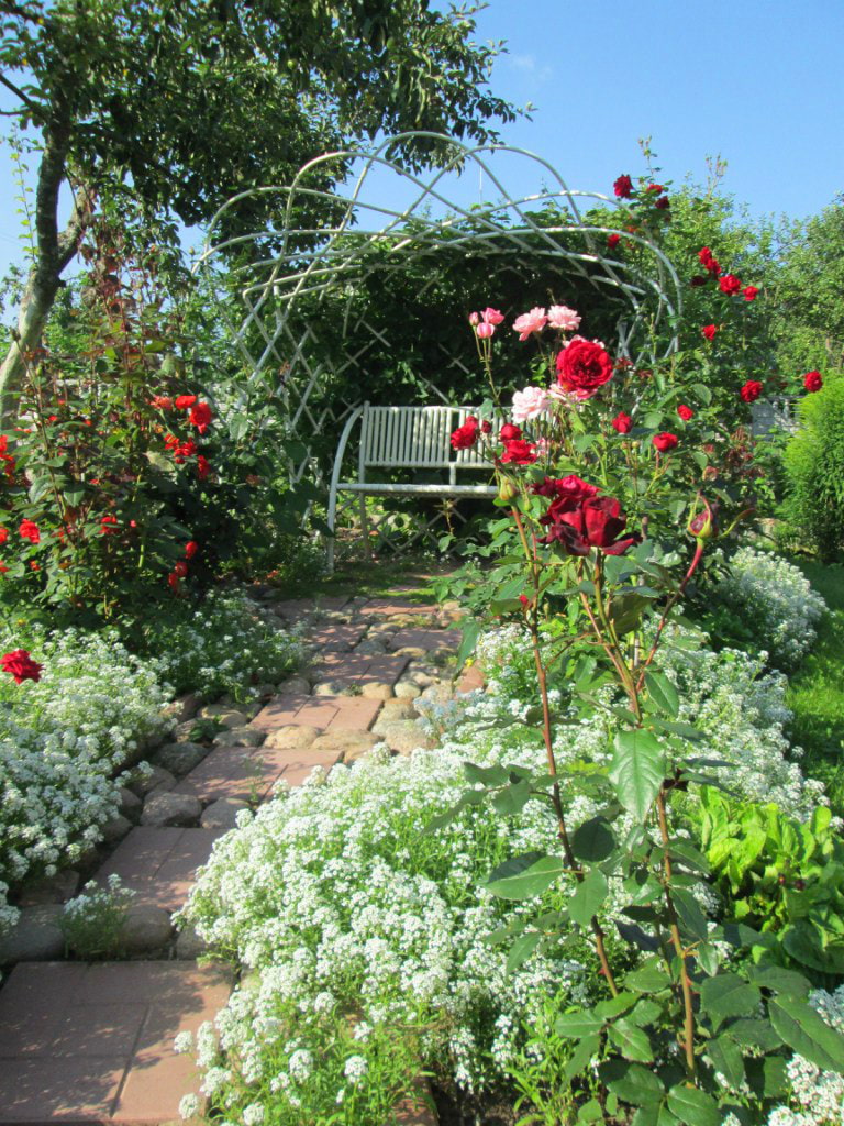 The pride of the owners of this summer cottage is a magnificent corner, surrounded on all sides by climbing roses. A path of tiles and stones leads to an elegant white bench. An elegant support for wild grapes will eventually turn into a green canopy and hide the bench from prying eyes.