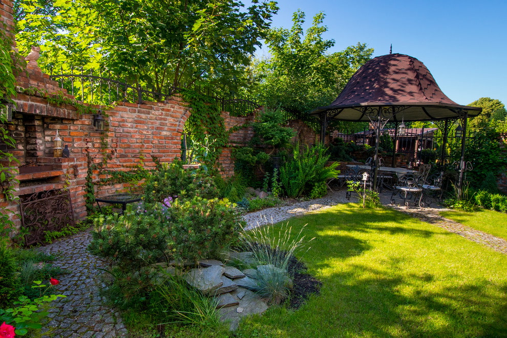 In the photo there is a well-thought-out garden with a cooking area and a wrought-iron gazebo. The brick fence is entangled with wild grapes, so it looks less massive.