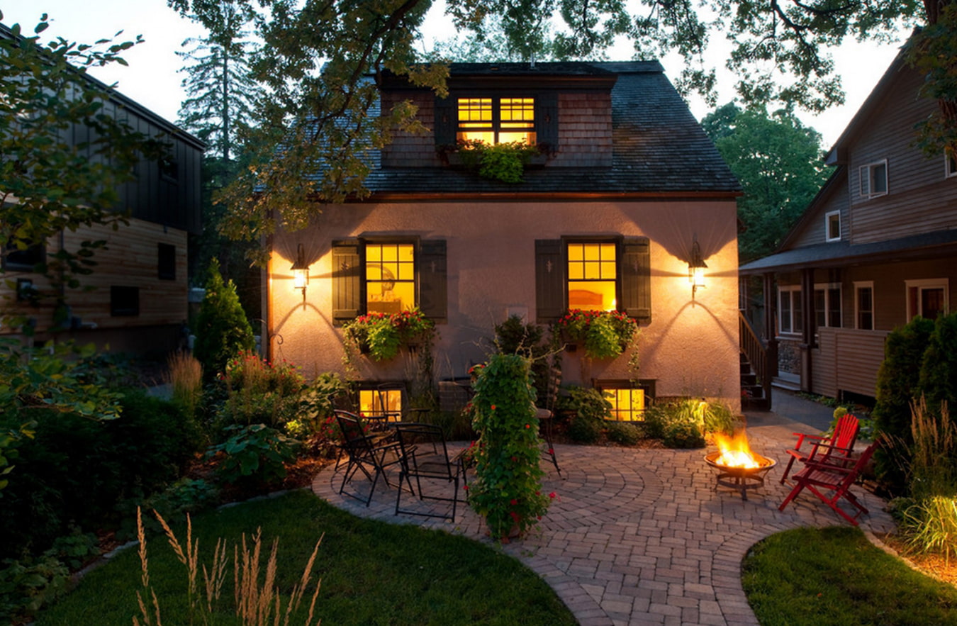 The depth and volume of a small area is given not only by plants and buildings, located according to all the rules, but also by competently organized light. To illuminate the territory, light-accumulating lanterns, garlands, street lamps powered by electricity are suitable. Decorative lighting will create various lighting scenarios that will optically expand the local area.