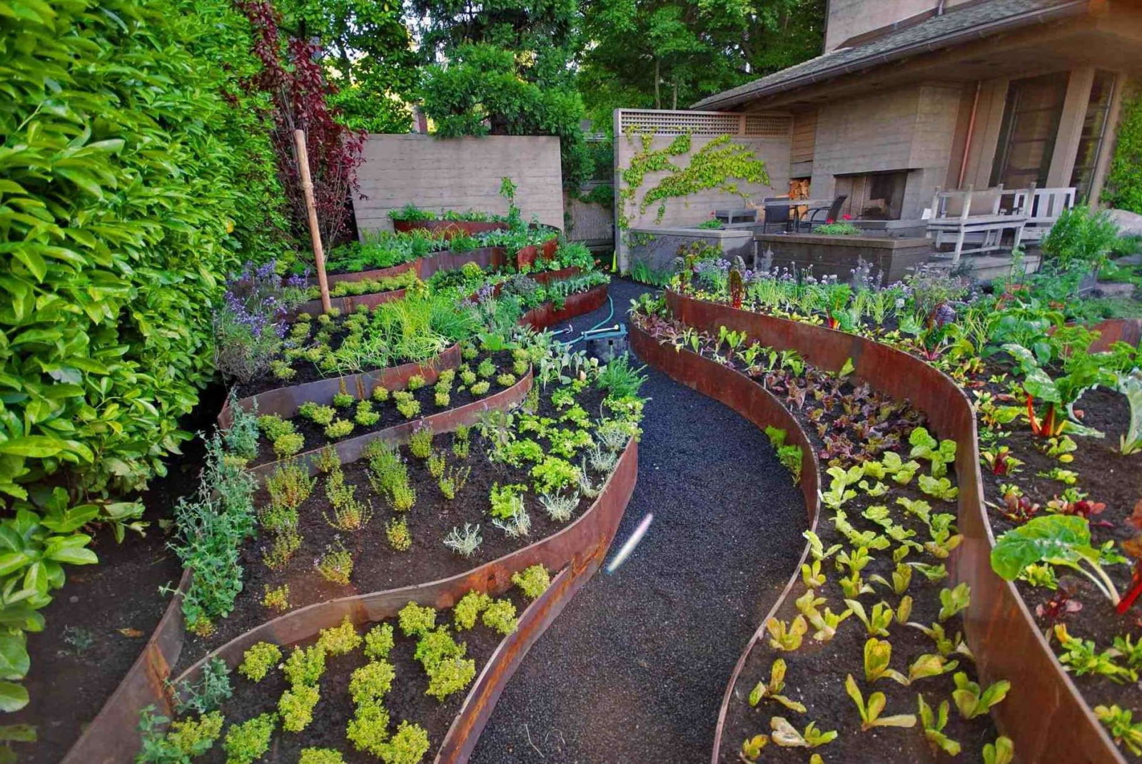 If the site is intended both for recreation and for growing vegetables, we recommend creating a neat mini-vegetable garden with framed beds. Such designs, which are easy to do with your own hands, rationally use a small area, look very neat and modern.