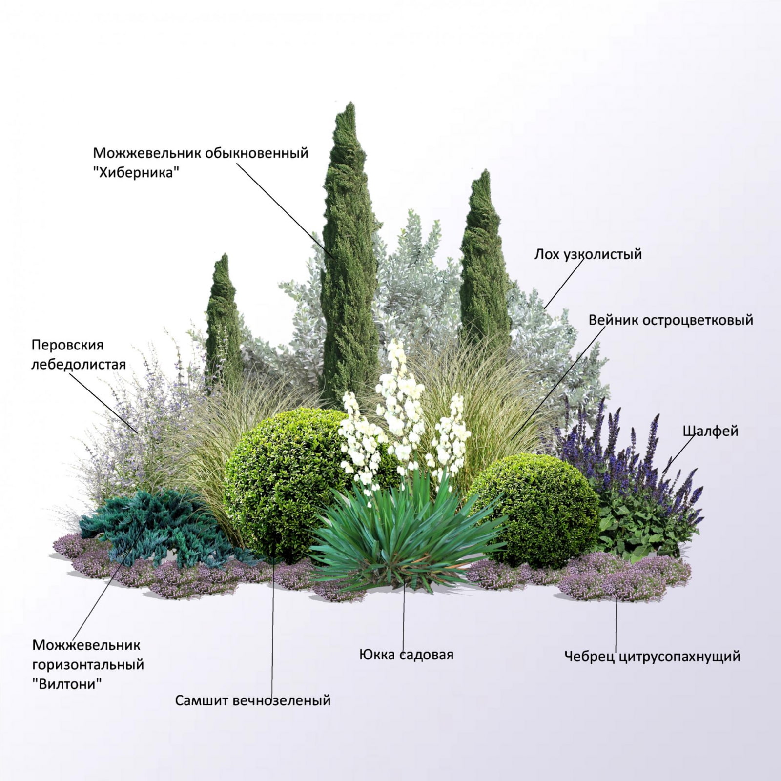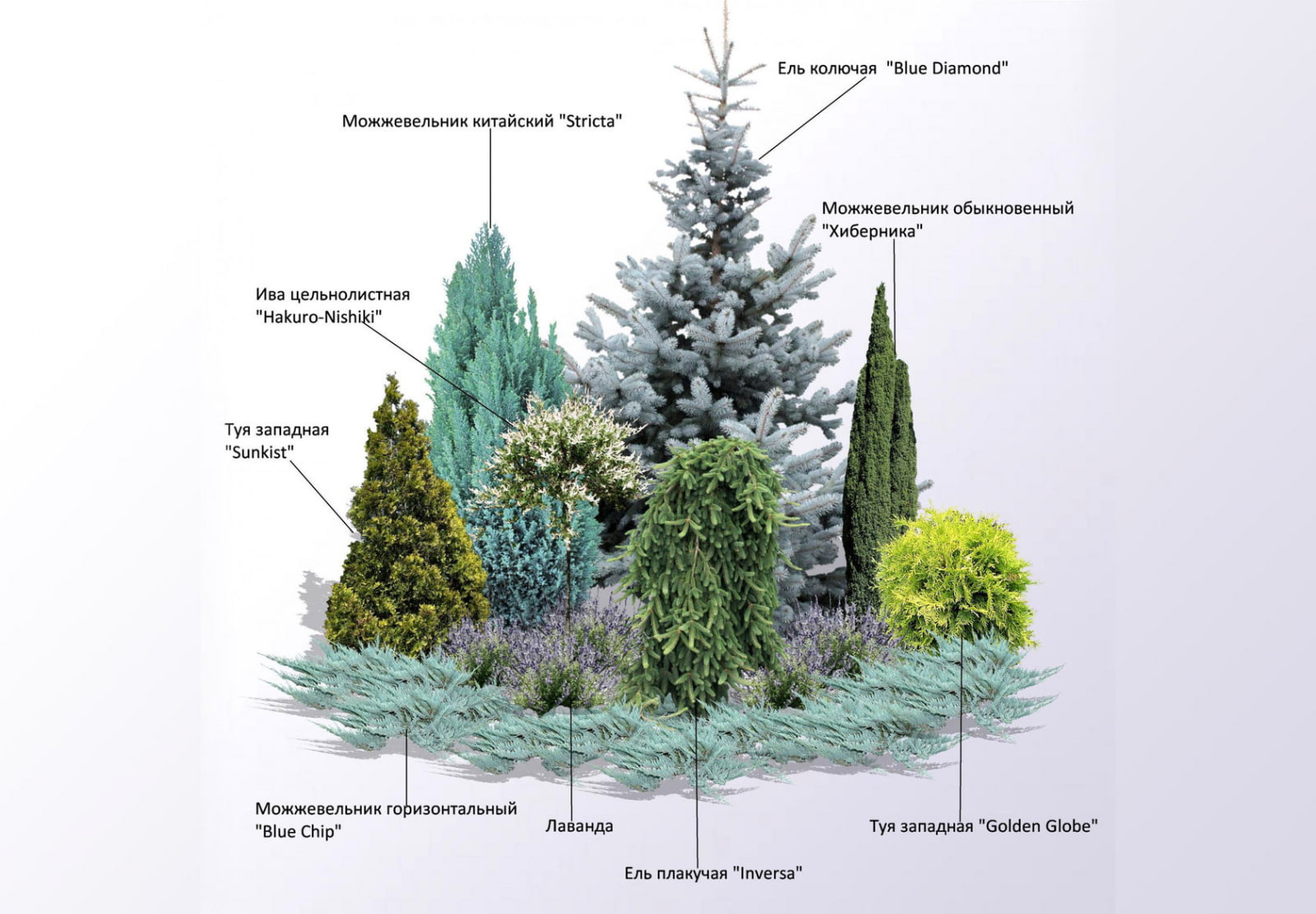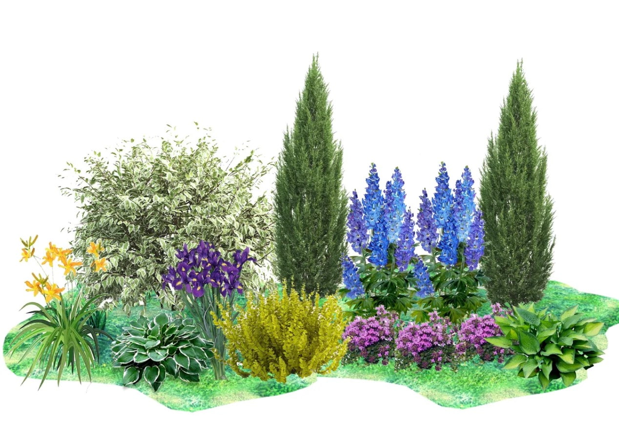 In the photo, a diagram of a mixborder made of conifers and shrubs