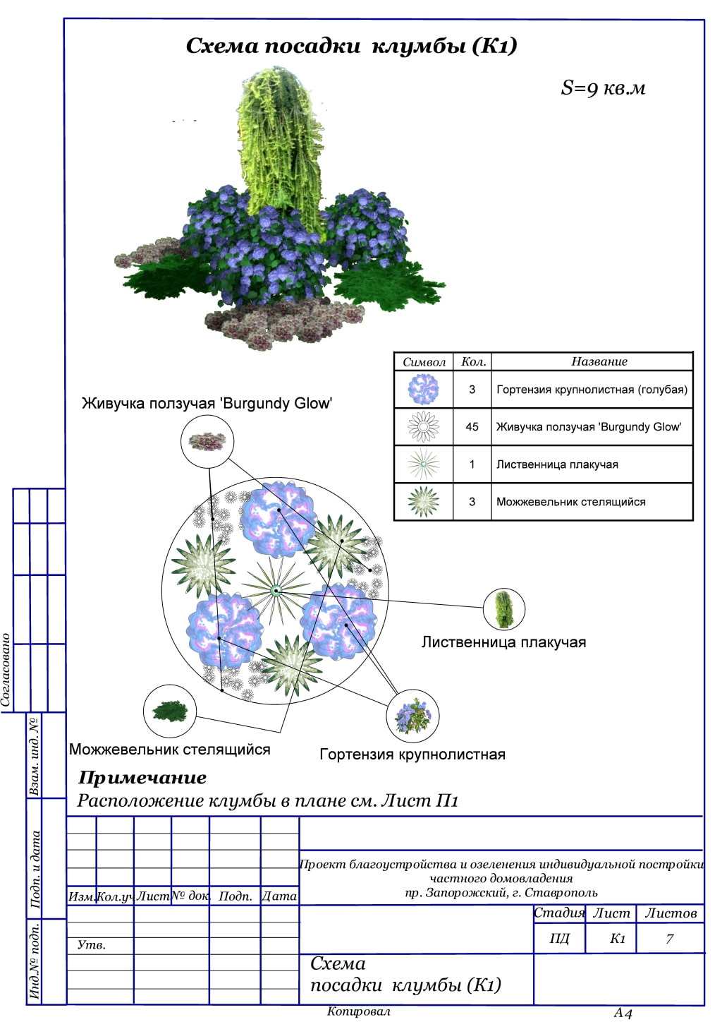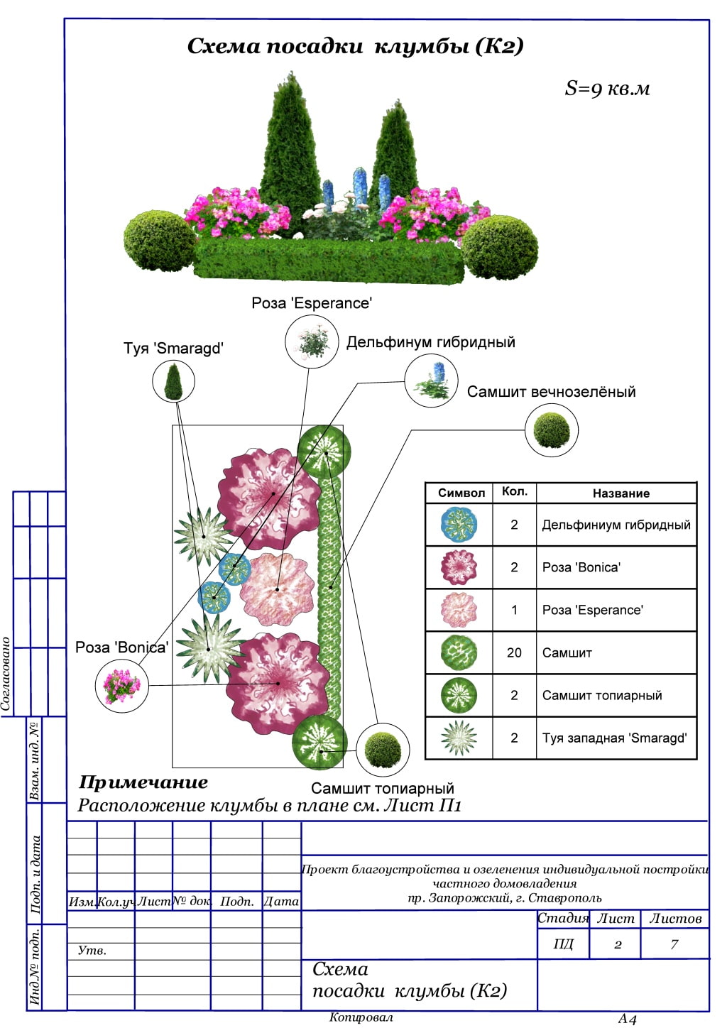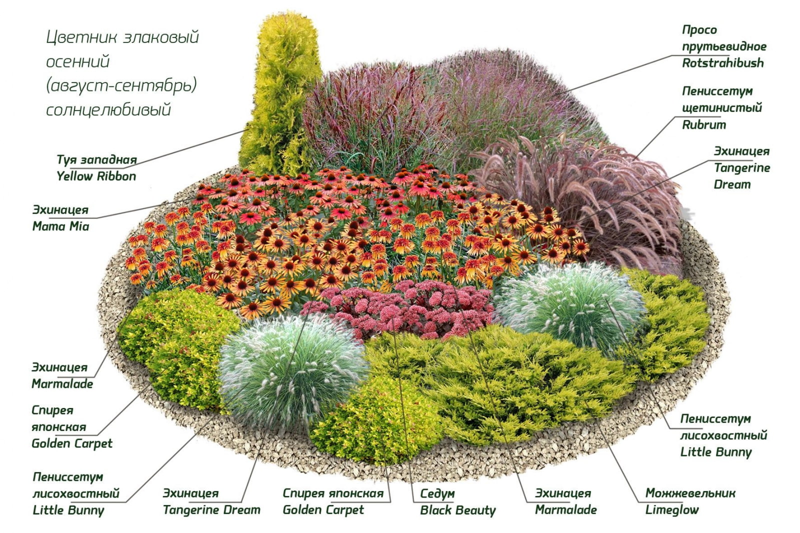 In the photo, a diagram of a mixborder made of conifers and shrubs
