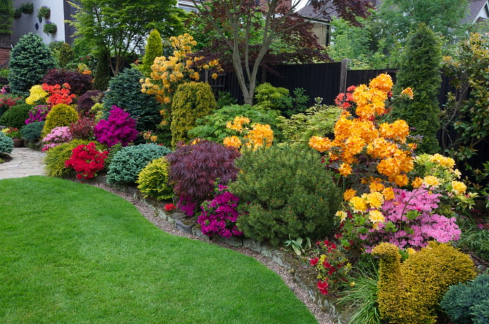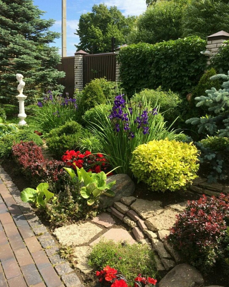 Combined mixborder options are most common: landscape designers combine annuals and perennials, flowering and conifers, deciduous and evergreens.