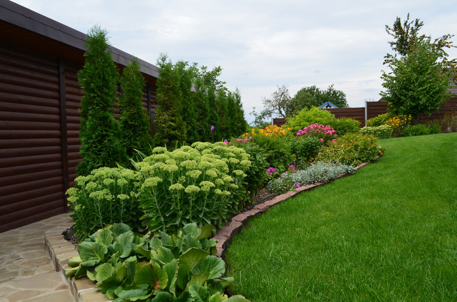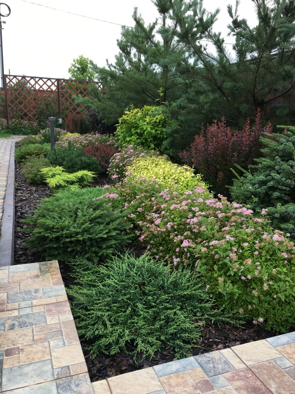 In this group, deciduous and flowering shrubs, dwarf conifers, tall flowers (for example, peonies). An example of bushes for an open sunny side: hydrangeas, phloxes, fieldfare, lilac, scumpia, willow. In shady areas, boxwood, spiraea, chubushnik, juniper will take root.
