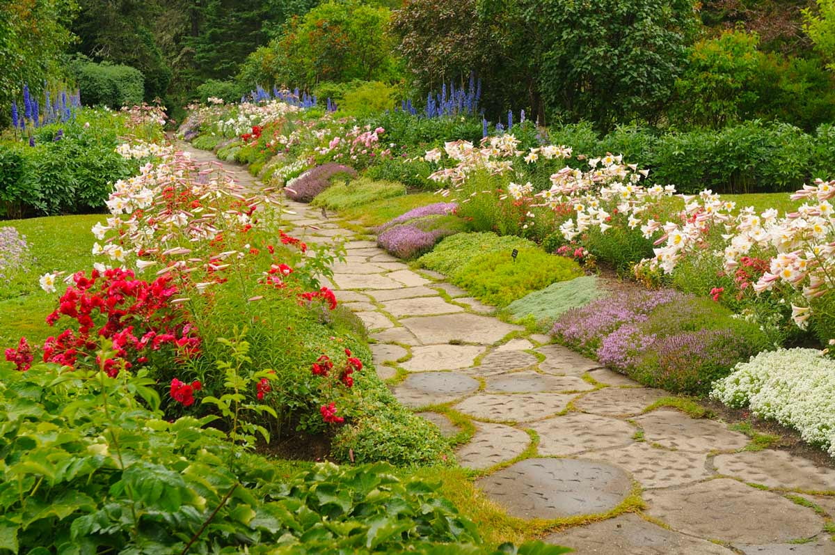 Small flower or creeping compositions are planted on both sides of the path.