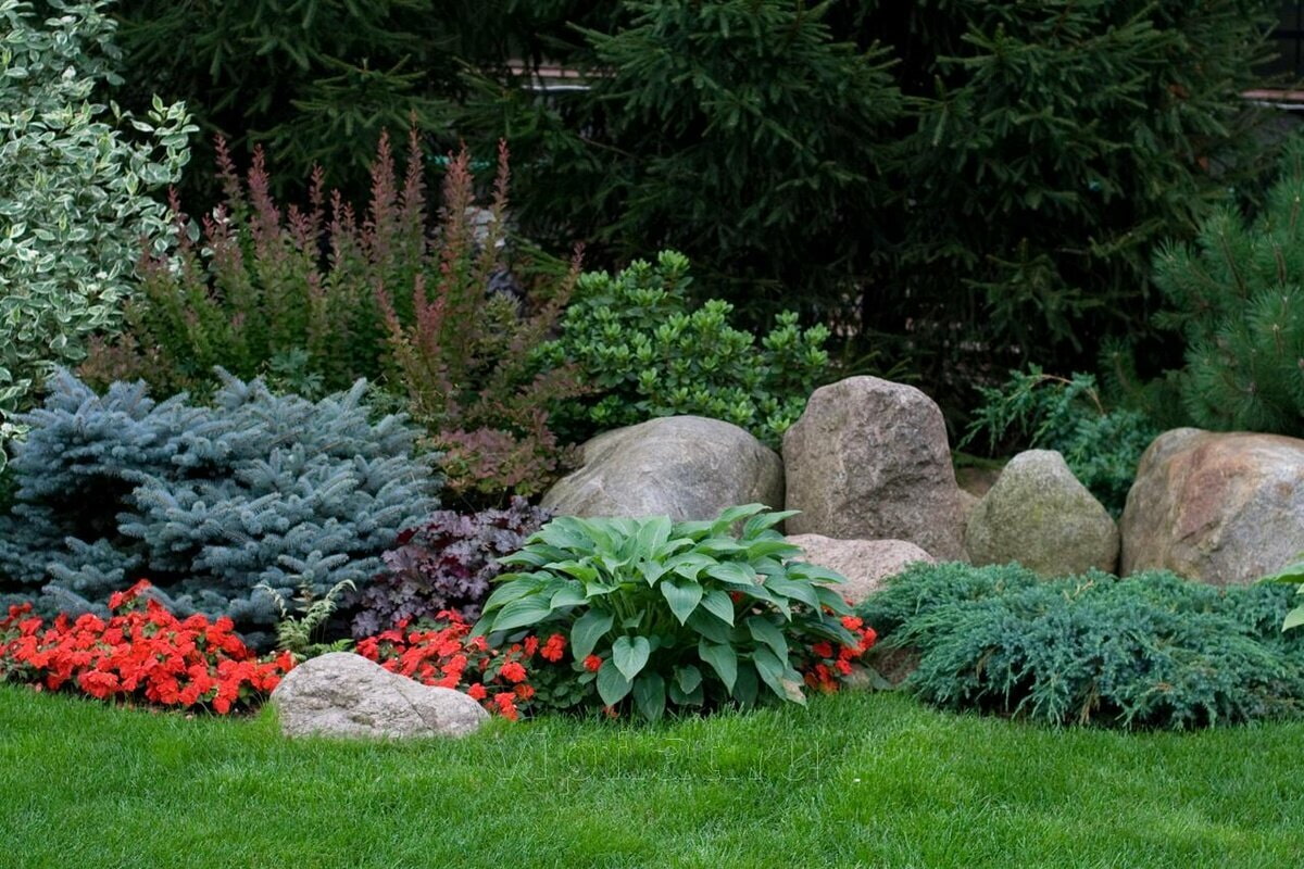 In order not to overdo it with color, choose one of your favorite flowers, and collect the main part of the composition from coniferous and deciduous shrubs.