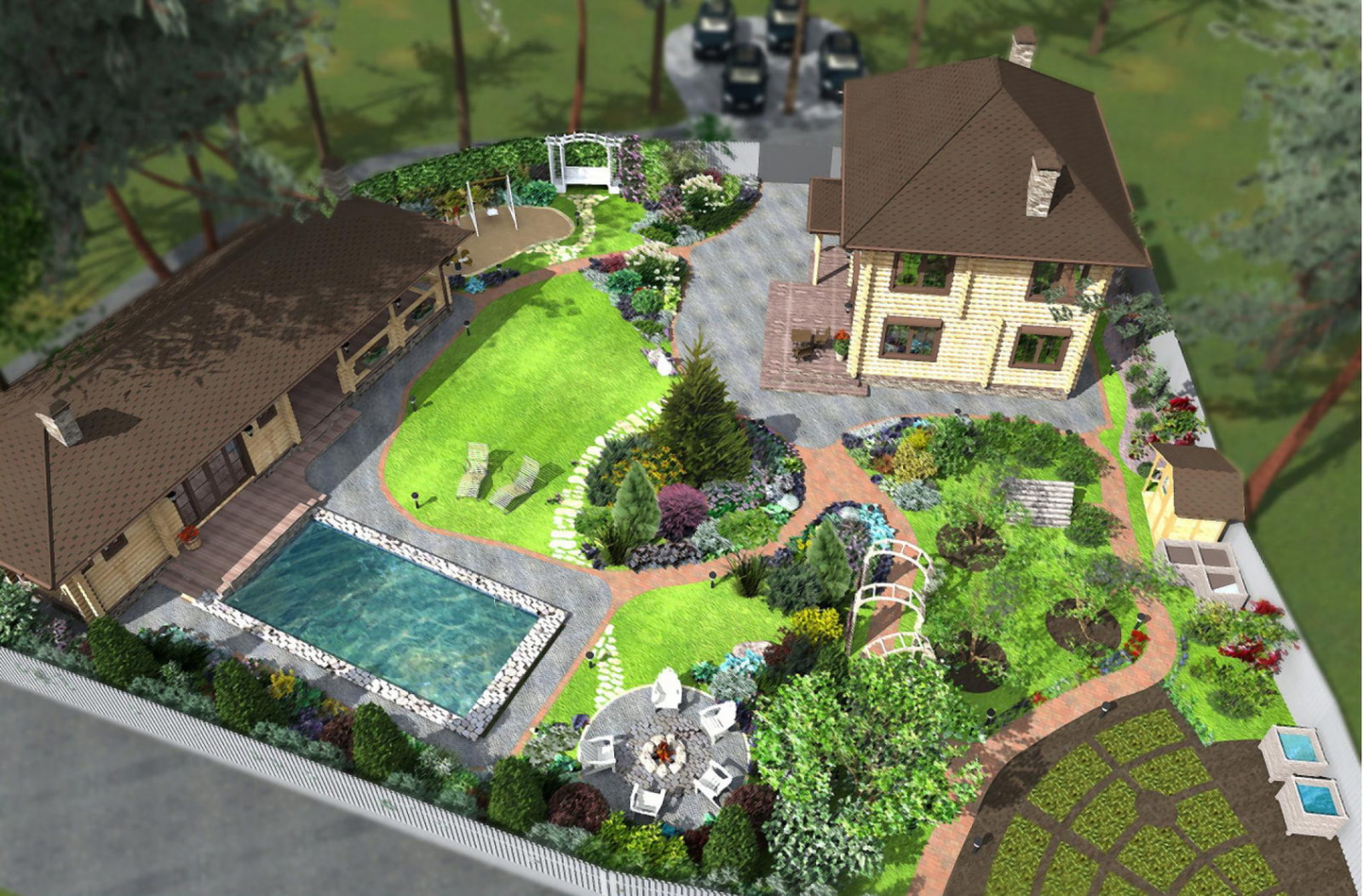 - Then you can move on to the location of secondary architectural forms: flower beds, flower beds, gazebos, fountains, pergola, swings, ponds, pools, benches, barbecues.
