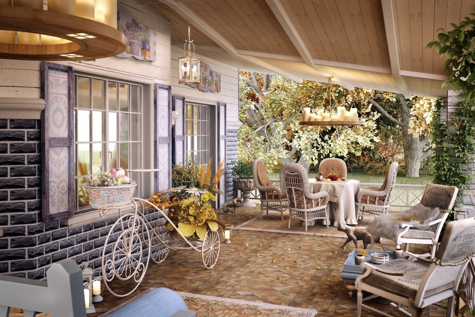 For the romantic french provence characteristic light plastered stone mansions with wrought-iron fences, balconies and wide terraces, spacious wooden gazebos and swings entwined with wild grapes, garden furniture with a touch of noble antiquity and lush flower beds where peonies, roses and lavender are fragrant.
