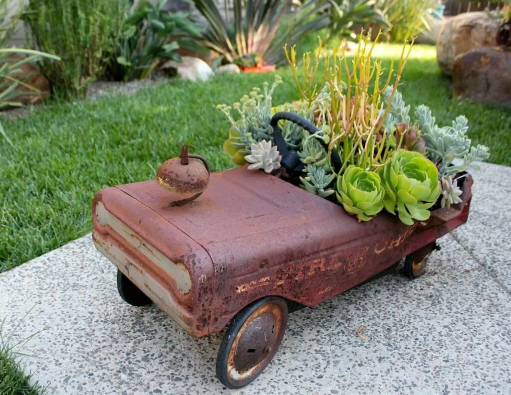 The children's machine has already served its purpose, but is it a pity to throw it away? The toy can be immortalized by turning it into an unusual container for flowers.Unpretentious plants that do not require a lot of space for the root system should be planted in the body. An old plastic truck (too bright for the landscape) can be painted in more natural colors or enamelled to look like metal.
