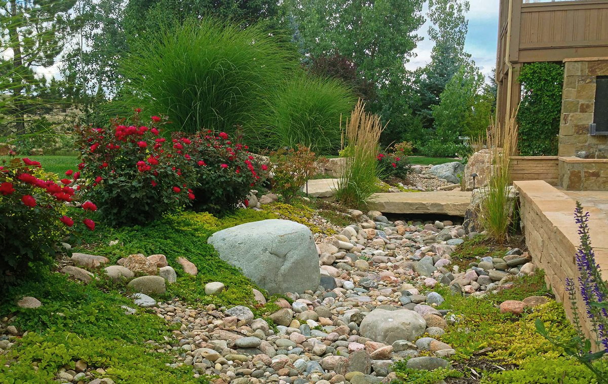 The photo shows a successful combination of a dry pebble stream with a rock garden made of large natural stone.