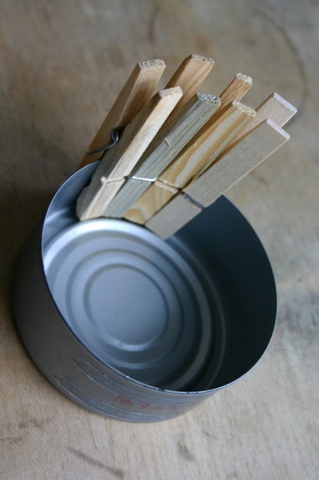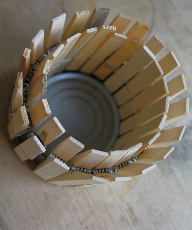 To make a flower pot with your own hands spread the clothespins over the rim of the can.