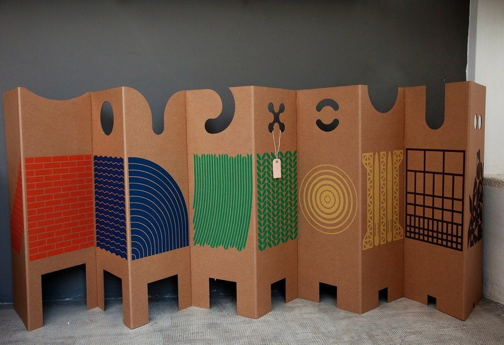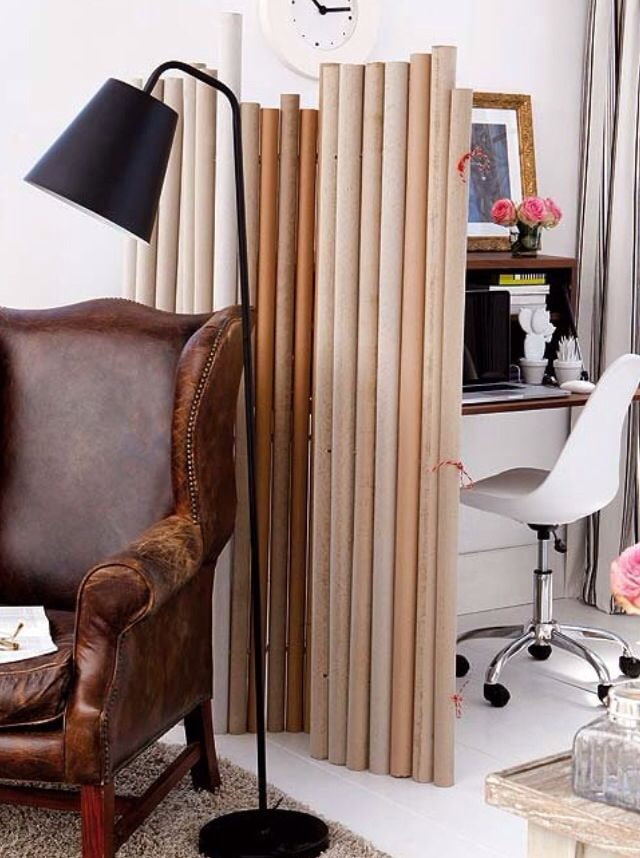 The photo shows a flexible do-it-yourself screen made of cardboard sleeves, dividing the room.