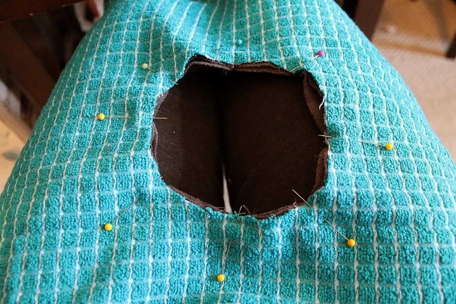 3. Pin or baste the seam with contrasting threads, then sew the neckline and towel together.