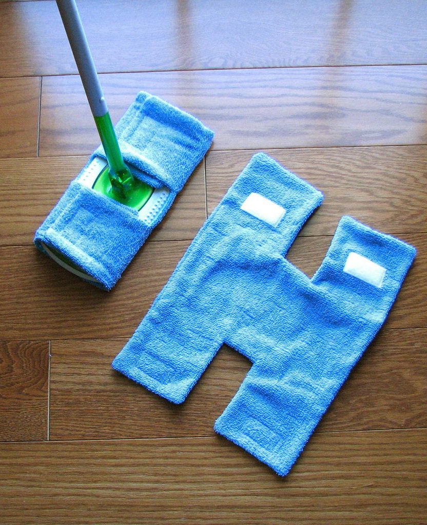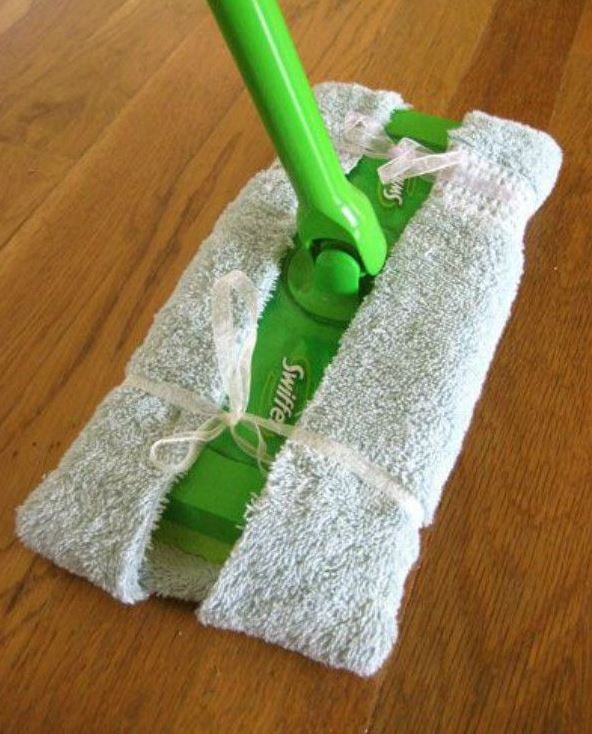 An old towel can be used as a doormat or used as a mop attachment. Sew together two H-shaped pieces to fit your mop and turn out.