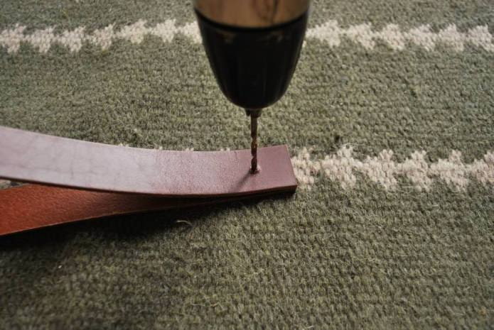 - We measure the desired size with a ruler and cut off the belts with a clerical knife. Fold each belt in half and drill the holes with a drill.