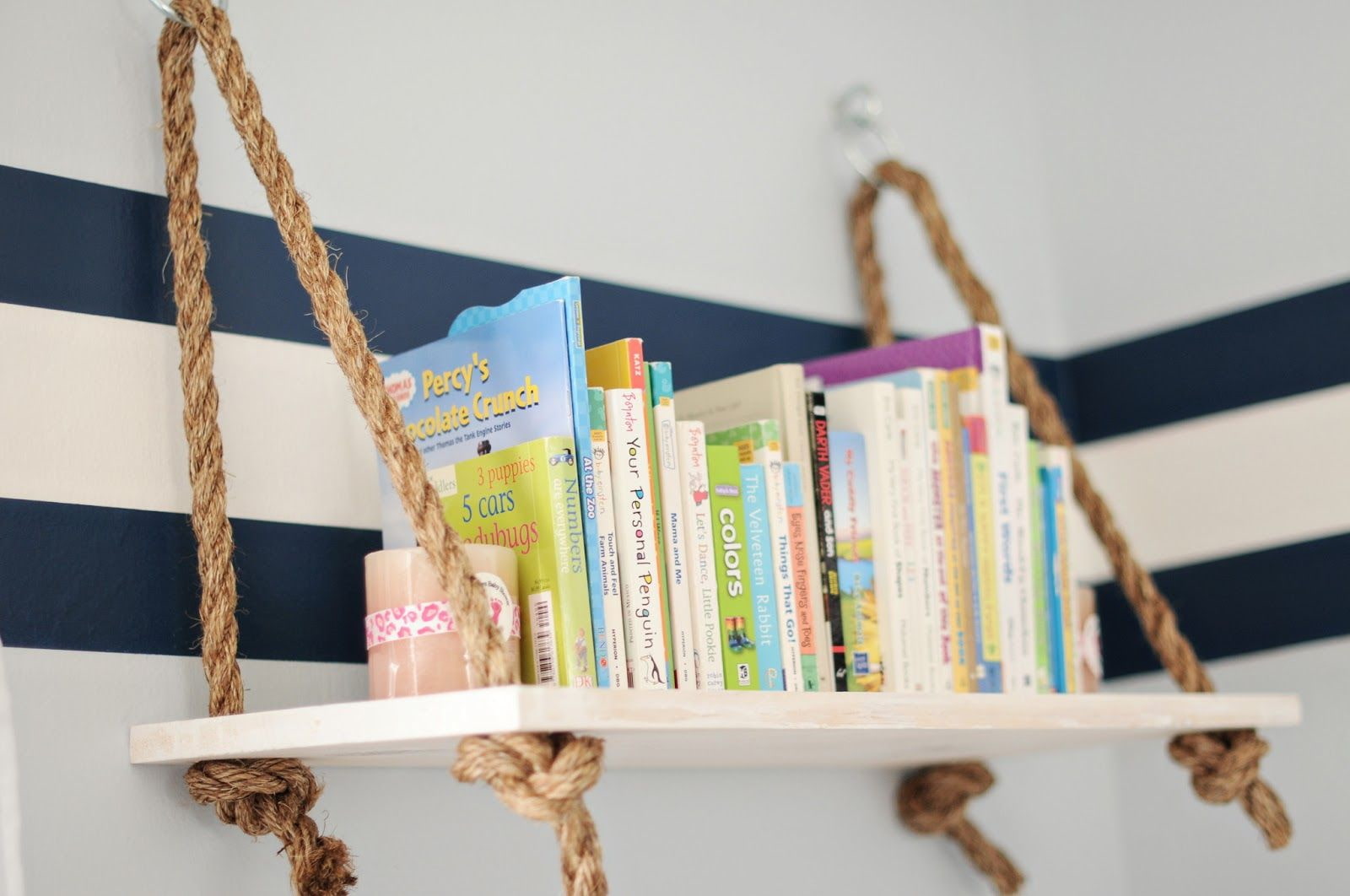 The photo shows an easy-to-manufacture hanging shelf on ropes.