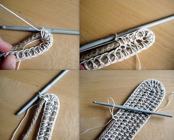 - We knit single crochet stitches through a jute cord.