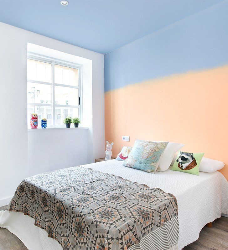 Bright shades are in vogue today. Therefore, if you have a can of paint in a bright color in your arsenal, you can paint one wall (or ceiling). This area will immediately attract attention. You can sew bright multi-colored pillowcases from textiles. Ideal if the paint and textiles are the same color.