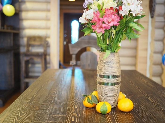 As a decoration, you can take various rhinestones, beads that are attached to new pots. Tin cans wrapped with dense and coarse twine look original. Such decor elements fit well into eco and ethno styles.