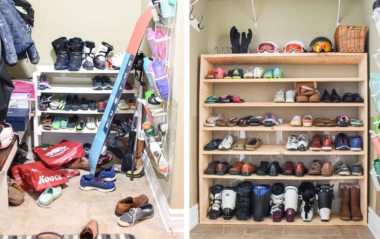 5. In the shoe rack shown in the photo, the number of rows alternates. The top row can be left free and house slippers can be stored there, or covered with a thick sheet of cardboard.