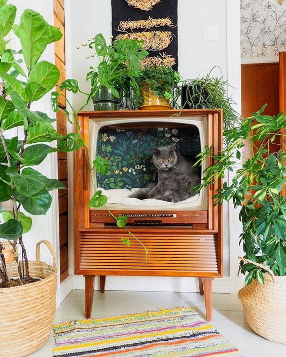 Retro TV will become a highlight of the environment if you play on the contrast "technology - live plants". The most interesting and favorite flowers can be placed inside the device, providing them with illumination.