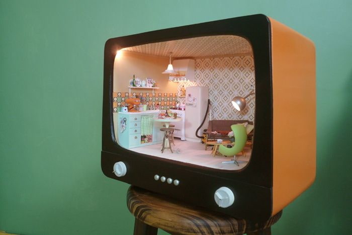 An old TV is perfect for lovers of an extraordinary hobby - drawing up large-scale miniatures in the form of living rooms. "Doll houses" are not intended for children: this composition is intended to decorate the interior, forcing to carefully consider small details. In combination with a TV and lighting, such a decorative element looks really impressive.