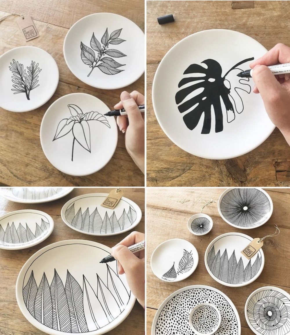 You can paint the plates yourself: you need acrylic paints or a special marker. The drawing depends only on your imagination. To securely fix the products, you will need hinges and self-tapping screws, but if you don't want to drill the walls, sticky fasteners from trusted manufacturers will do.