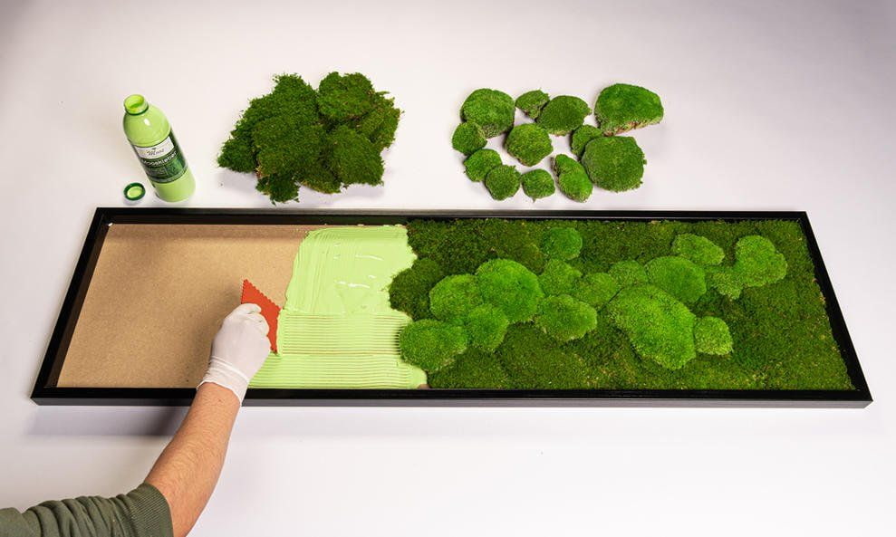 A durable photo frame or plywood sheet is used as the basis for the panel, and for filling - stabilized mossthat do not require watering. It is collected in forests, removing moisture, debris and living creatures, and soaked in a glycerin solution, adding a dye. Ready-made moss is easy to find at craft stores.