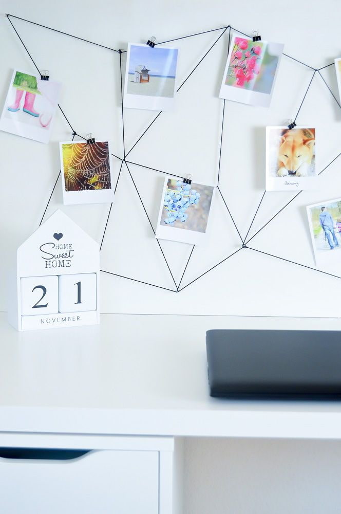 An option for those who do not mind making several holes in the wall. To create you need a strong twine, nails with a hammer and printed photographs.