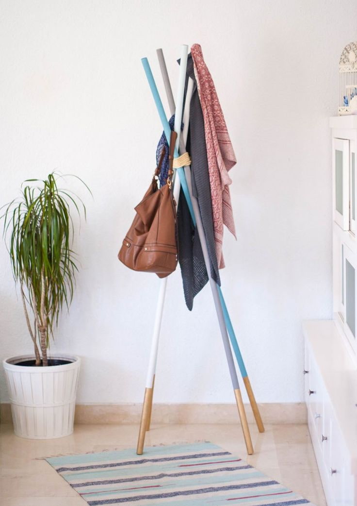 This upright wooden pole tripod is easy to make yourself. It looks stylish and non-standard, but does not require any special skills and abilities when created. The hanger is great not only for clothes, but also for storing hats, accessories and handbags. The structure can be equipped with hooks or secured with a hoop.