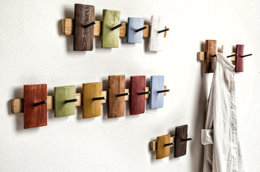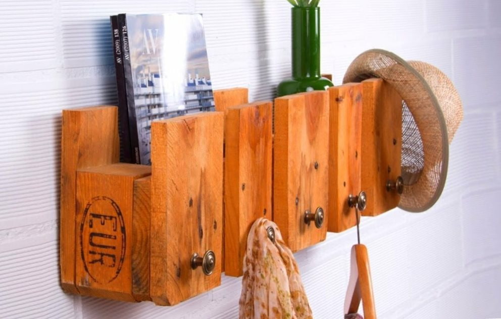 A pallet hanger fits perfectly into a bright modern interior. For its production, it is recommended to choose a pallet that meets the EUR or EPAL standards. First, you need to clean the workpiece from dirt and process it with a grinder: there should be no dangerous defects on the surface. Then you should saw off the excess parts of the pallet, leaving only the frame. The structure can be painted or varnished. The last step is to fix the hooks for caps, scarves and other things, after which the product can be hung on the wall.