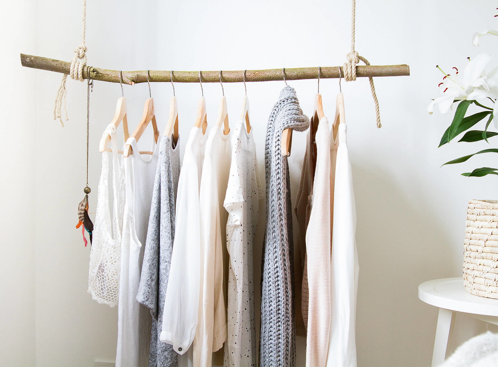 In the photo, a do-it-yourself hanger made of wood and branches.
