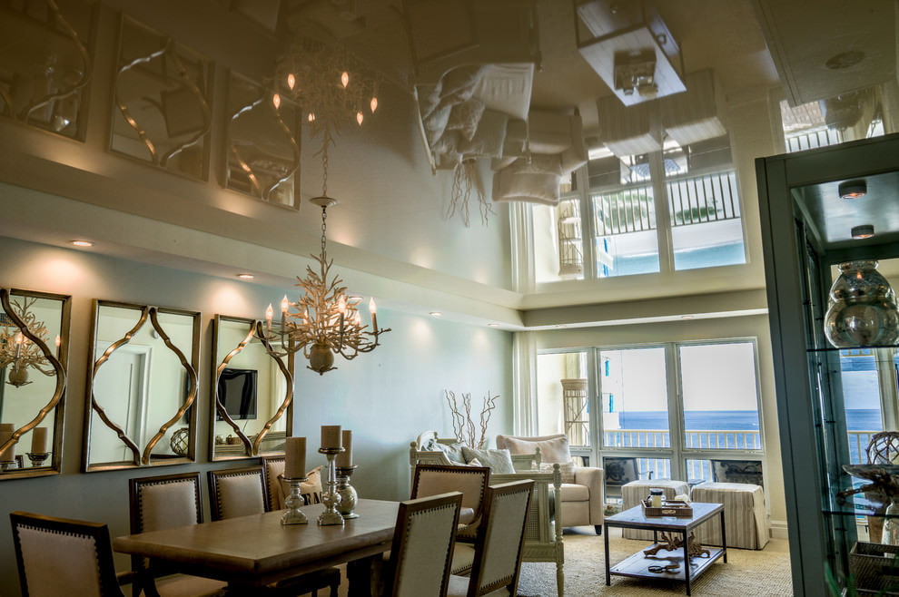 The photos below show examples of the use of glossy stretch ceilings in rooms for various functional purposes.