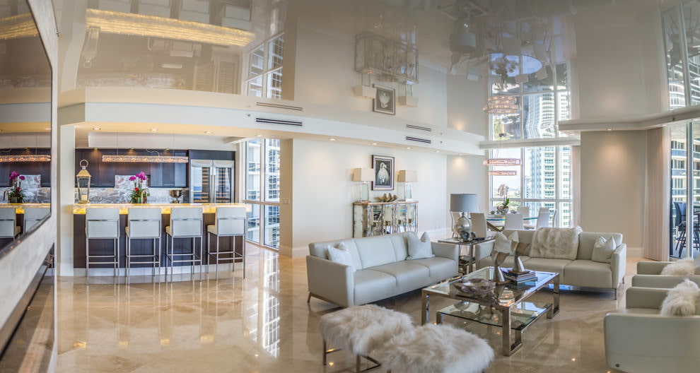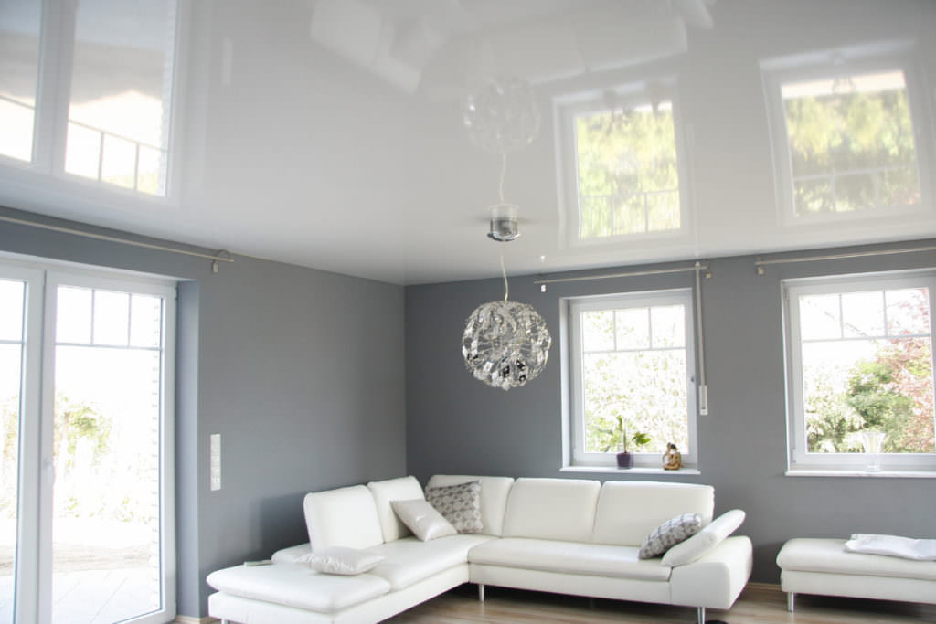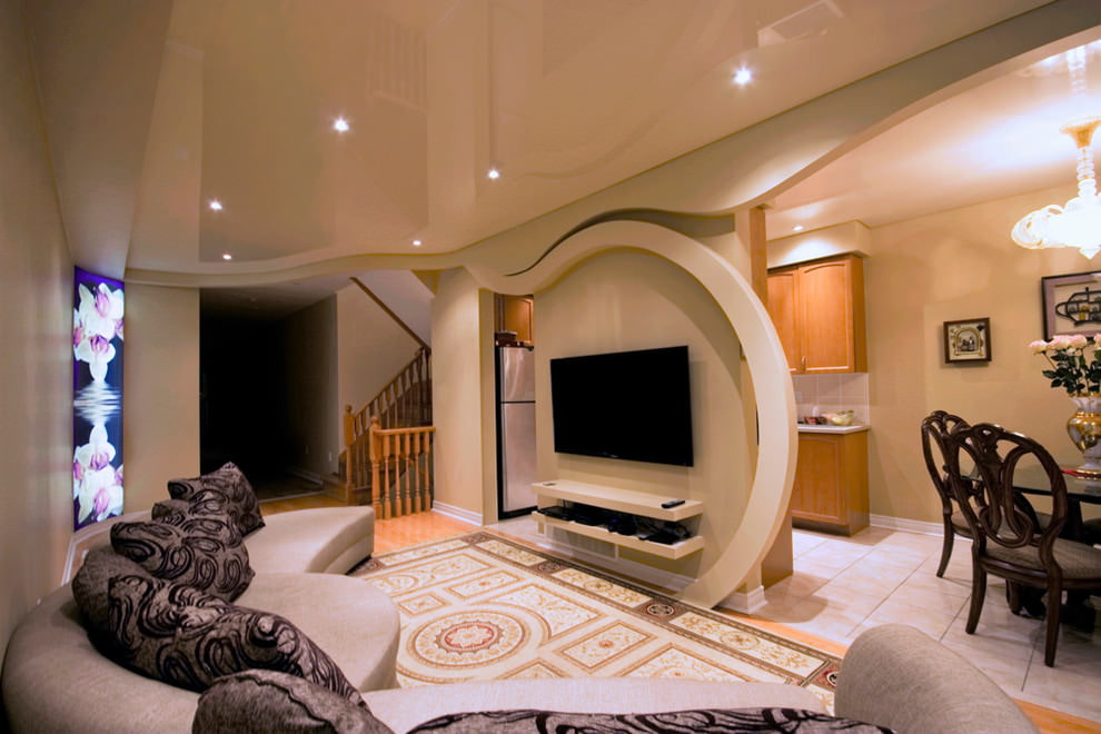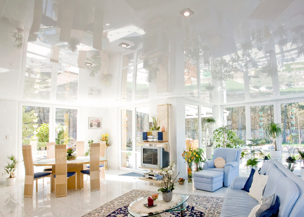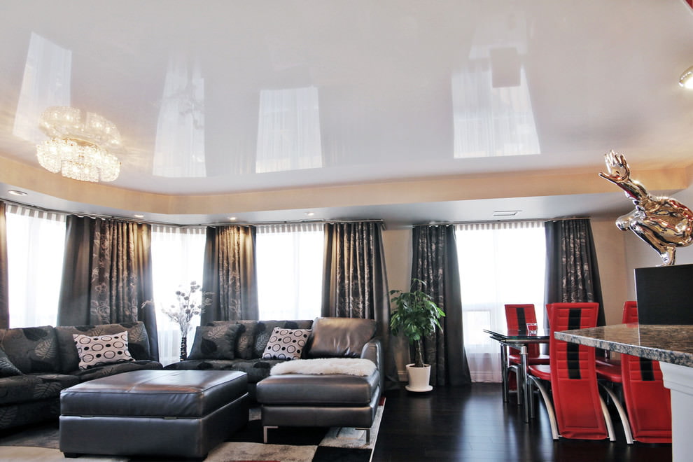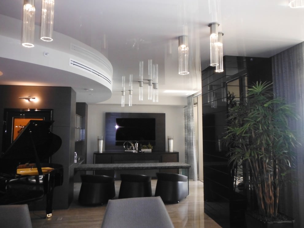The glossy stretch ceiling in the living room can be done in any color as the functionality of the room itself, its size and overall style allows. It is best to choose a two-level design that will allow you to combine two colors (both similar in shade and contrasting) and divide the living room into a reception area and a desktop area.