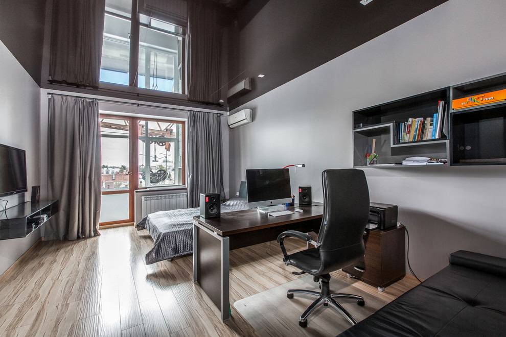- Black shades can be used in spacious, light rooms and offices. It is better to confine yourself to a small glossy insert against the background of a red or white ceiling.