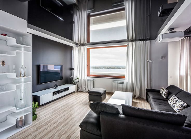 On the picturethe accent black wall and sofa have become visual accents and support the choice of glossy canvas color.