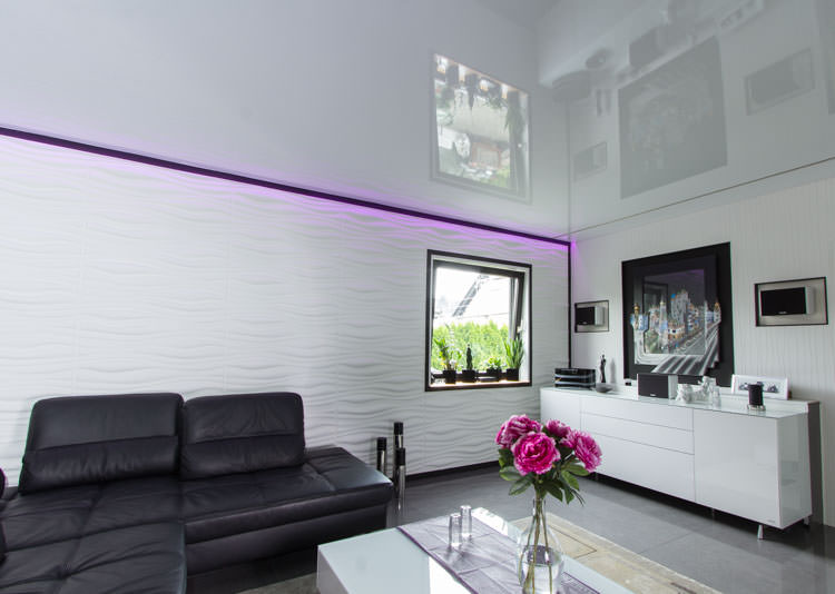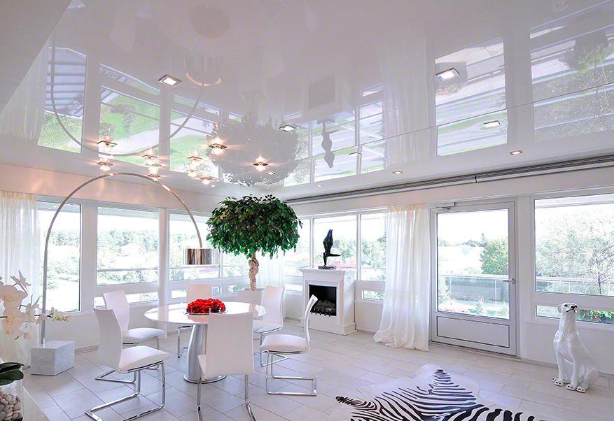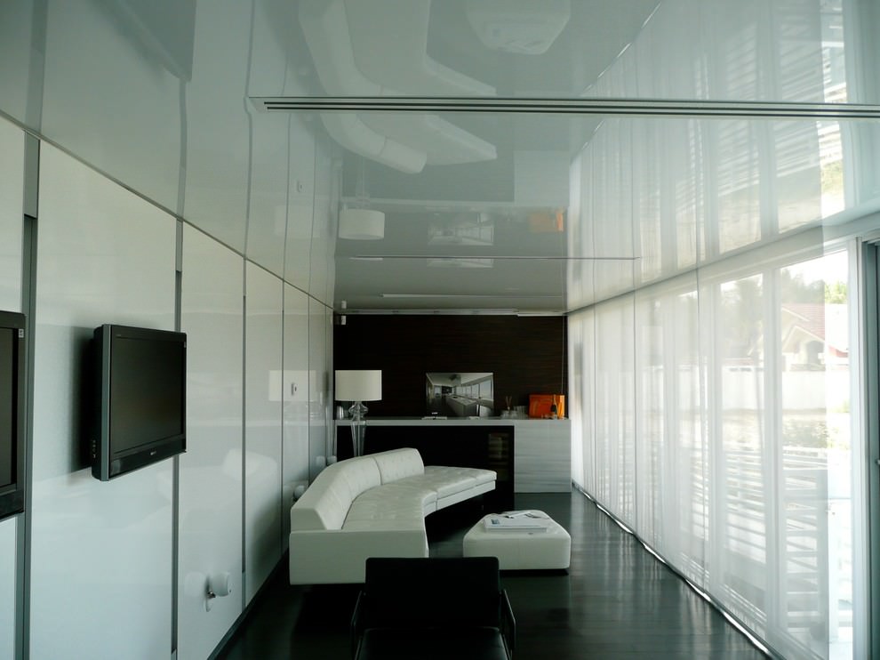 On the picturea glossy single-level ceiling, glare and its snow-white color give the interior an extraordinary lightness and a sense of purity and light.