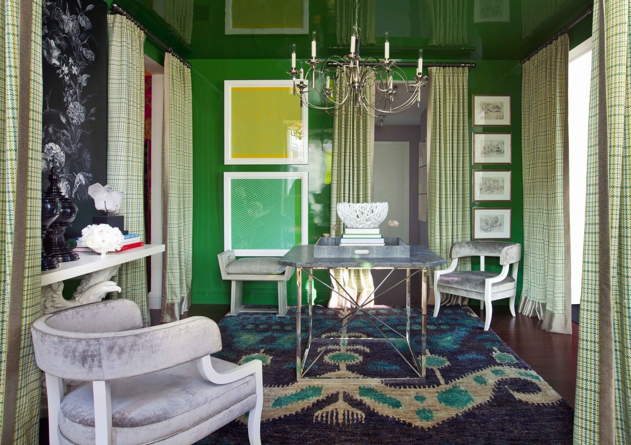 Green is soothing and relaxing. In the photo, the green glossy ceiling and accent wall look harmonious in the lounge.