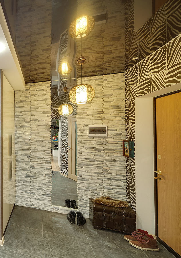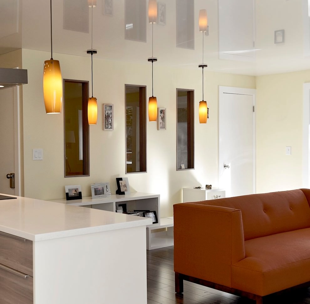Glossy single-level stretch ceilings require the least amount of material, time and money. They serve for a long time, are easy to care for, and are available in a wide range of designs and colors. Photo printing looks good on them. The combination of colors in the interior divides the room into functional areas.