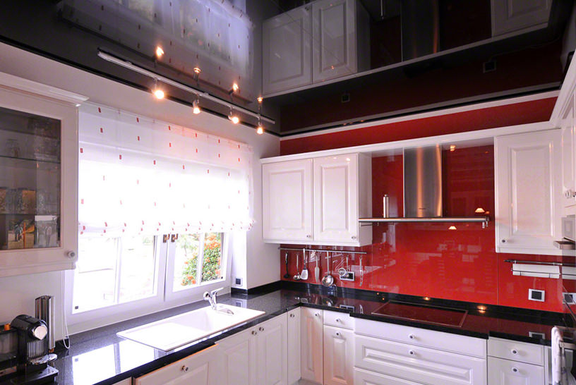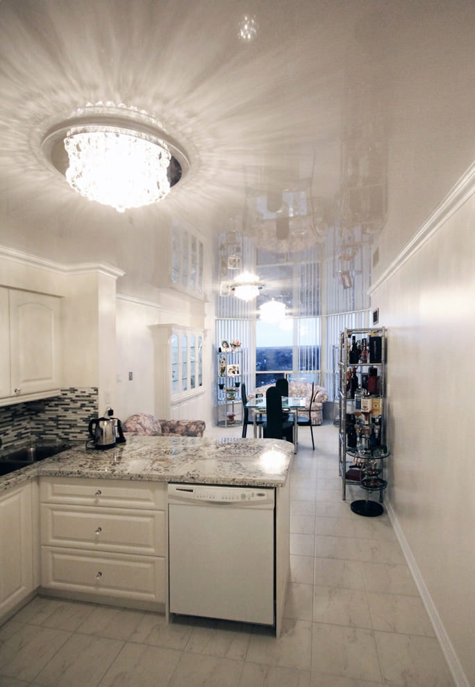 A glossy stretch ceiling in the kitchen will zone the space and illuminate the work surface. It can be used without fear to decorate the kitchen, as it is not afraid of moisture and fumes, does not attract dirt. In addition, it is easy to care for (if there are splashes or greasy stains, then it is enough to wipe them with a cloth and detergent without a strong onslaught).