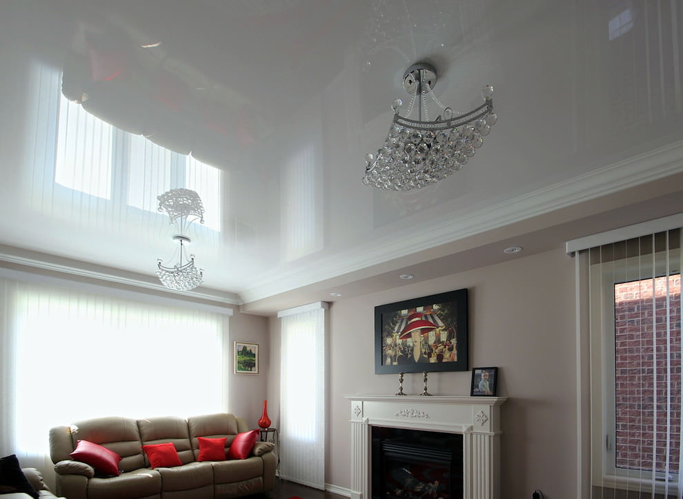 On the picture the living room seems even lighter due to the reflection of the light of the chandeliers from the glossy surface of the white canvas. In this case, the ceiling is the background, not the accent.