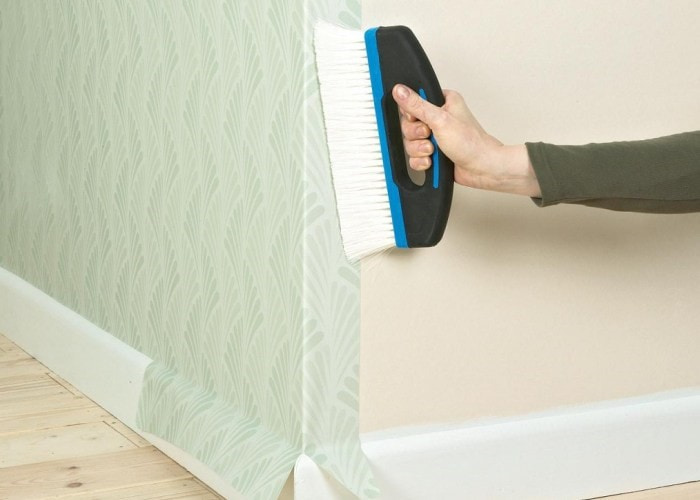 - With a plastic spatula, the wallpaper is pressed against the corner.