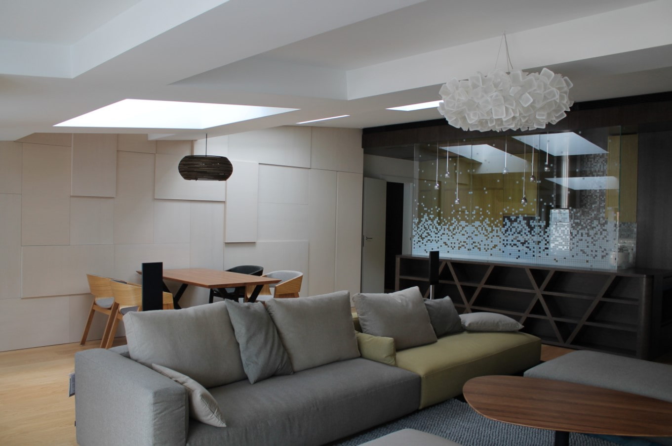The decorative option is to accentuate the dining area. The wall in the dining room can be left as it is, supplemented with lighting or decor (paintings, clocks, posters).